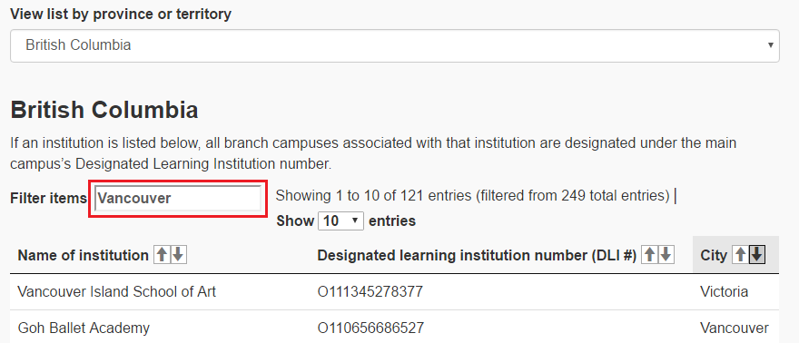 tại mục View list by province or territory, lựa chon tỉnh bang nơi sẽ học tập (ở đây lựa chọn British Columbia)