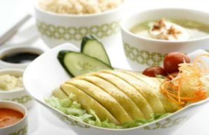 Món cơm gà Hải Nam có nguồn gốc xuất sứ từ vùng Hải Nam, Trung Quốc và rất nổi tiếng ở Malaysia và Singapore. Tuy cách nấu giống nhau nhưng thực chất món ăn này ở mỗi quốc gia đều có những biến thể để phù hợp với khẩu vị của mỗi quốc gia. Ở Singapore, cơm gà Hải Nam được xem như là quốc thực của Singapore và thường được phục vụ tại các cuộc triển lãm quốc tế, các sự kiện mang tính toàn cầu và tại các nhà hàng Singapore ở hải ngoại. Cơm gà Hải Nam cũng là một trong các món ăn Singapore được phục vụ trên các chuyến bay của Công ty Hàng không Singapore. Món ăn này cũng thường có mặt trong thực đơn của các nhà bếp ở các trường đại học Singapore.