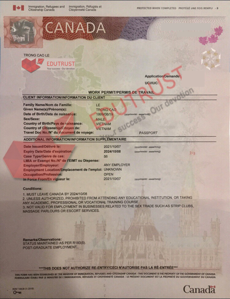 CHÚC MỪNG BẠN LÊ TRỌNG CAO ĐÃ ĐƯỢC CẤP POST-GRADUATION WORK PERMIT (PGWP)