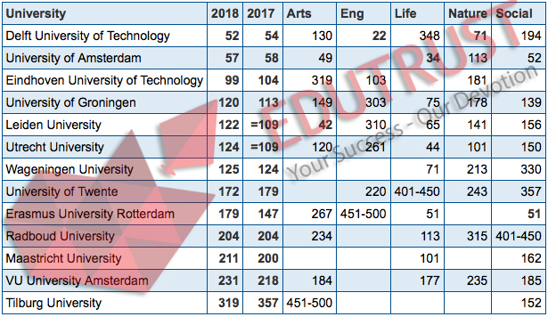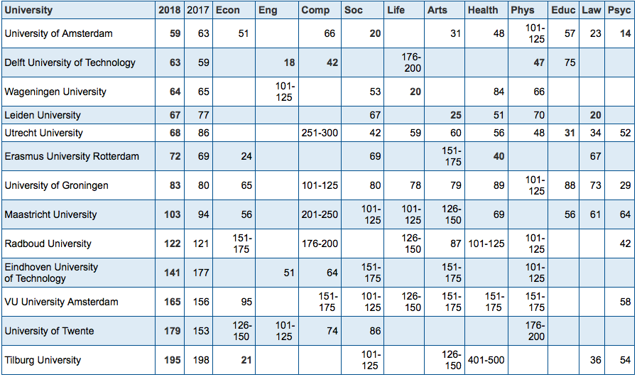 Bảng dưới đây chứa các vị trí tổng thể và theo danh mục của các trường đại học nghiên cứu Hà Lan trong Bảng xếp hạng Đại học Thế giới năm 2017-2018 trong các lĩnh vực khoa học sau: Business & Economics (Econ), Engineering & Technology (Eng), Computer Science (Comp), Social Sciences (Soc), Life Sciences (Life), Arts & Humanities (Arts), Clinical, Pre-clinical & Health (Health), Physical Sciences (Phys), Education (Educ), Law (Law) and Psychology (Psyc).