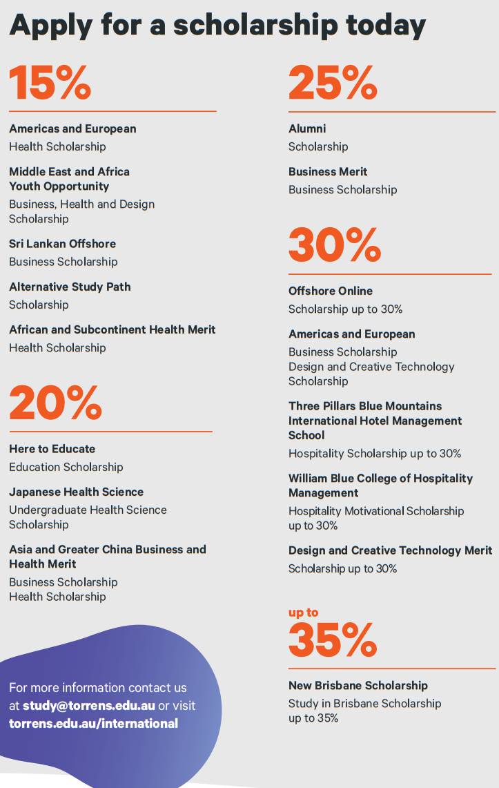 Torrens University Australia cung cấp nhiều loại học bổng cho sinh viên trong nước và quốc tế. Học bổng ở cả bậc đại học và sau đại học.