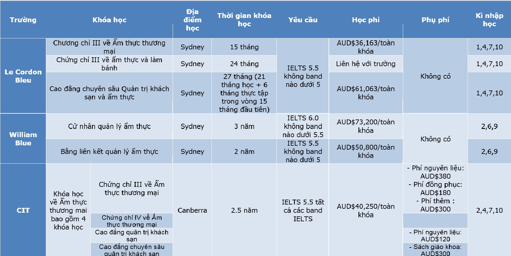 Hầu hết các trường đào tạo ngành bếp chuyên nghiệp tại Úc đều đạt chuẩn quốc tế và bằng cấp được nhiều nước trên thế giới công nhận. Các bạn có thể tham khảo danh sách các trường đào tạo ngành bếp nổi tiếng của Úc dưới đây: